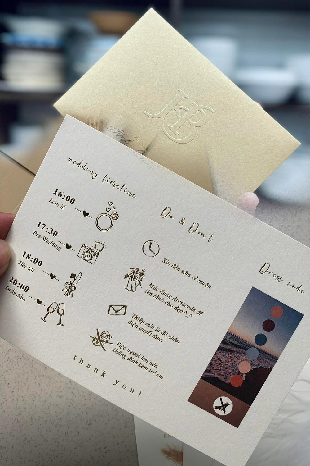 Tuy nhiên, bên cạnh hình ảnh cô dâu - chú rể nổi bật trên thiệp cưới thì các quy định được gửi đến khách mời cũng là điều mà dân tình quan tâm. Theo đó, ngoài việc thông báo về dresscode, đám cưới của Minh Hằng có 2 lưu ý: Không mang giày cao gót và không dắt theo trẻ em "vì đây là tiệc người lớn".