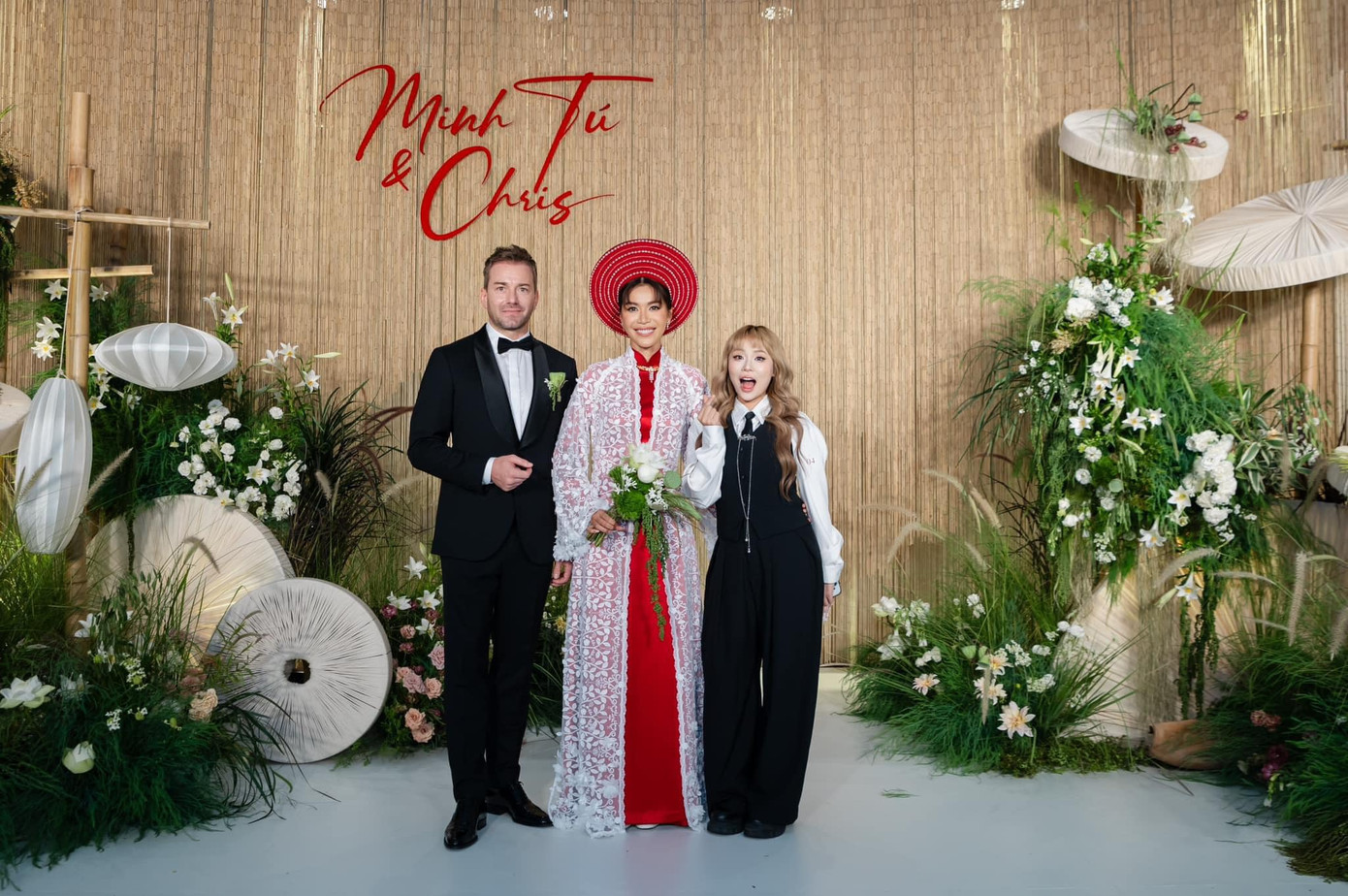Hôm nay, đám cưới của siêu mẫu Minh Tú và chồng ngoại quốc chính thức diễn ra tại TP.HCM. Trong ngày trọng đại, cô dâu Minh Tú lựa chọn phong cách hoài cổ, áo dài đỏ khoác áo ren trắng kết hợp cùng chiếc khăn đỏ truyền thống được cho là lấy cảm hứng từ mẹ ruột. Chú rể Chris chọn bộ vest đen, đeo nơ lịch lãm.