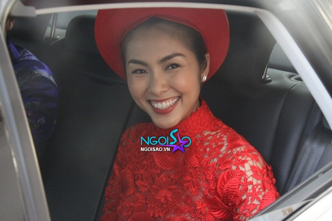 | Sau bao mong mỏi, cuối cùng cô dâu Tăng Thanh Hà cũng xuất hiện rạng ngời trong bộ áo dài ren gam đỏ. |