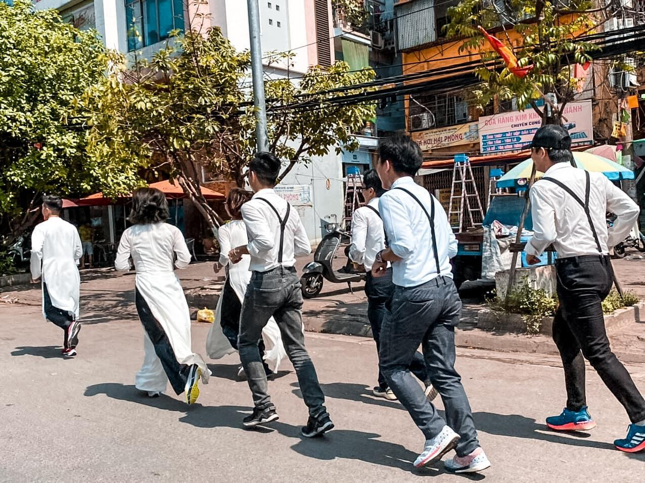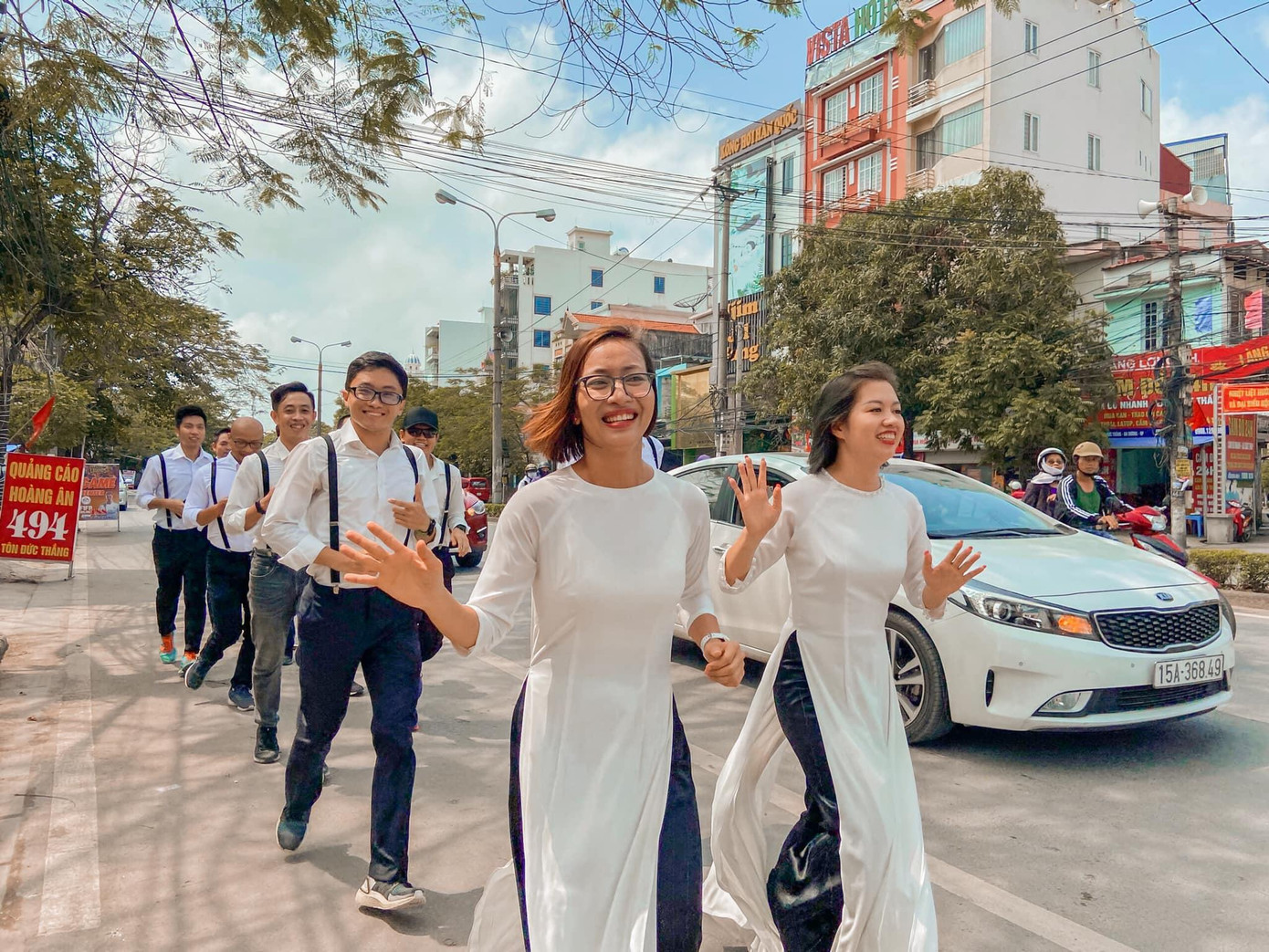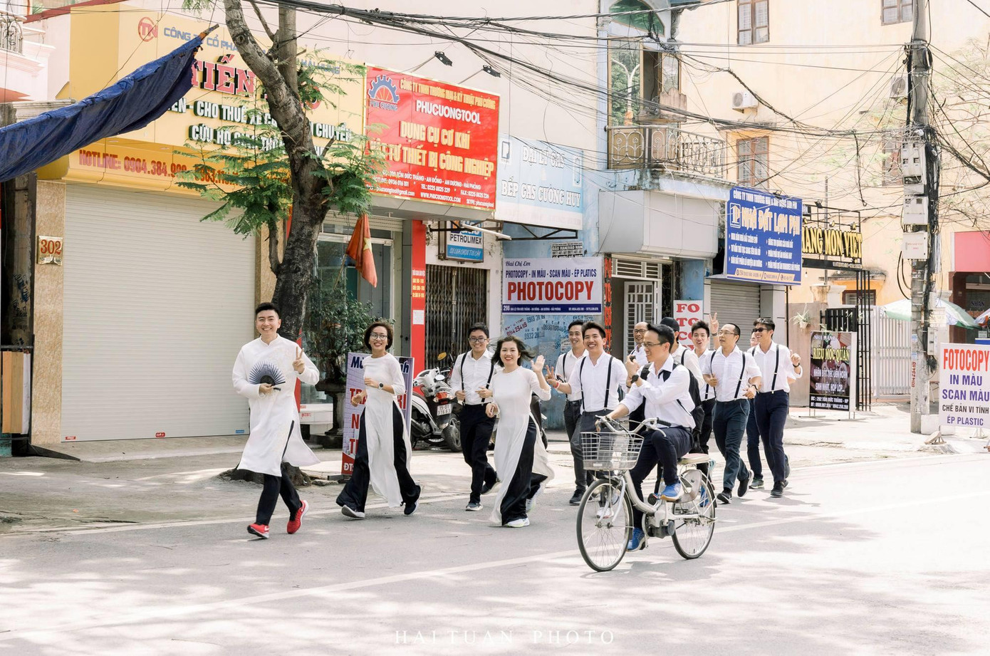 | Hình ảnh chú rể lịch lãm diện áo dài cách tân trắng, theo sau là đoàn người với nữ xinh tươi mặc áo dài, nam bảnh bao với trang phục Suspender (quần dây đeo nam) chạy bộ trên quãng đường dài 4km ở thành phố Hải Phòng đã thu hút sự chú ý và ánh mắt ngưỡng mộ từ nhiều người. |