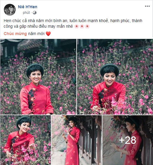 Hoa hậu Hoàn vũ H'hen Niê đăng bộ ảnh áo dài đỏ rực rỡ bên hoa đào, gửi đến mọi người lời chúc năm mới tốt đẹp nhất.