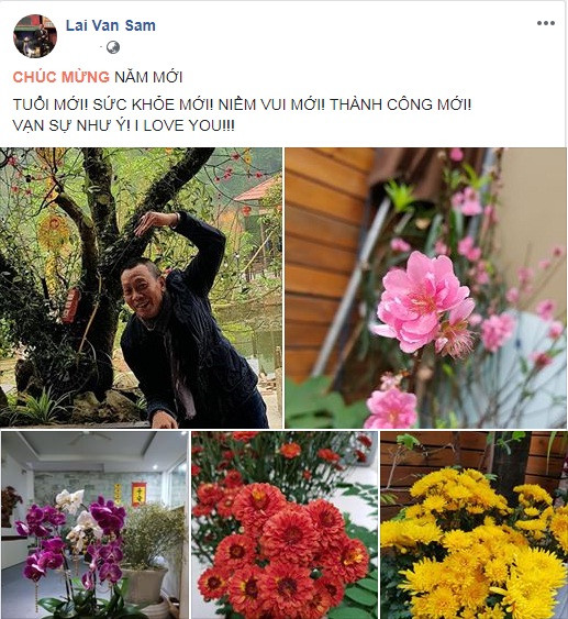 Nhà báo - MC Lại Văn Sâm đăng ảnh tạo hình dễ thương bên cây đào và ngôi nhà tràn ngập hoa kèm lời chúc: "Chúc mừng năm mới! Tuổi mới! Sức khỏe mới! Niềm vui mới! Thành công mới! Vạn sự như ý! Love you!".