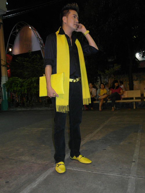 Khi chọn phụ kiện có tông màu chói mắt, Mr Đàm đều khéo léo phối hợp chúng với những trang phục có gam màu trầm, màu tối. Điển hình như việc phối hợp cả "cây đen" khi đi giày màu vàng chanh tiệp màu ví cầm tay và khăn choàng cổ.