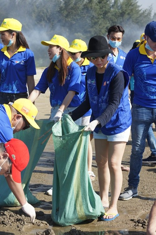 Thu Minh khác lạ khi dọn rác ở bãi biển