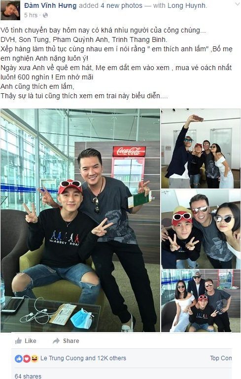 Mới đây, Đàm Vĩnh Hưng tỏ ra thích thú khi được Sơn Tùng M-TP thổ lộ tình cảm cá nhân và gia đình dành cho mình. Theo đó, “ông hoàng nhạc Việt” chia sẻ: “Vô tình chuyến bay hôm nay có khá nhiều người của công chúng... Đàm Vĩnh Hưng, Sơn Tùng, Phạm Quỳnh Anh, Trịnh Thăng Bình. Xếp hàng làm thủ tục cùng nhau em ấy nói rằng “Em thích anh lắm", “Bố mẹ em nghiện anh nặng luôn ý. Ngày xưa anh về quê em hát, mẹ em dắt em vào xem, mua vé oách nhất luôn! 600 nghìn ! Em nhớ mãi”.