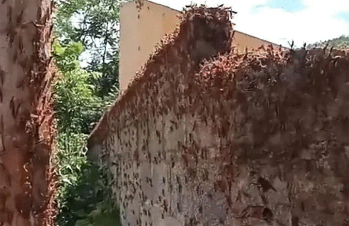 | Châu chấu xuất hiện từng đàn, đậu kín trên cành cây, tường nhà. |