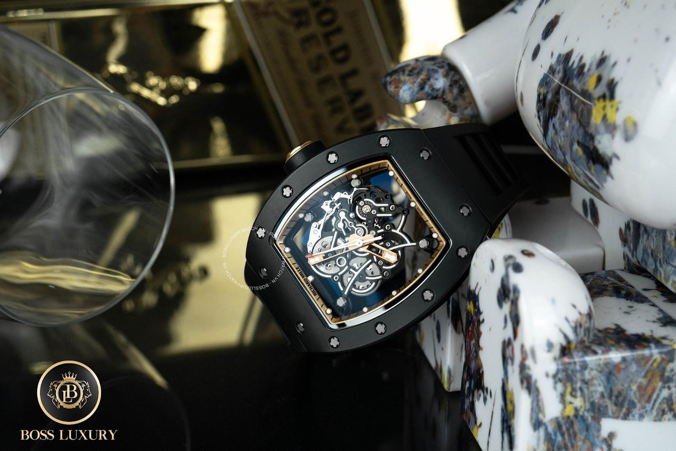 Richard Mille đã chọn xác định những chiếc đồng hồ mà hãng sản xuất bằng cách đi theo một lộ trình khác với sản xuất đồng hồ Thụy Sĩ truyền thống, đó sẽ là những cỗ máy ấn tượng, đẳng cấp nhất và RM 055 Black là cỗ máy thời gian nổi bật nằm theo quy luật đó. RM-055 Black có vỏ case hình chum rượu. Đây là chiếc đồng hồ dành cho người chơi golf nên rất nhẹ và có khả năng chống sốc, chịu lực rất tốt. Bộ máy được tinh chỉnh phù hợp để có thể chịu được những va chạm bất ngờ hay cú đập mạnh.