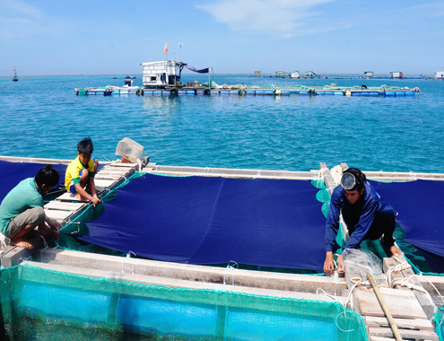 Ngư dân Lý Sơn buộc che màn chống nắng cho tôm hùm. Ông Phù Thanh Hải (ngụ xã An Vĩnh) vừa đầu tư 1,4 tỷ đồng đóng lồng bè, mua gần 3.000 tôm giống đưa về nuôi ở đảo.