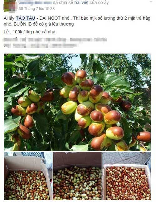 Một đại lý bán hàng online quảng cáo: “Lại vào mùa táo tàu tươi rồi cả nhà ơi. Táo tàu tươi là loại quả đặc biệt tốt cho sức khoẻ, vị ngọt thanh, tính hàn, tươi giòn xốp, bạn nào hay mất ngủ hoặc nóng ăn rất tốt cho sức khoẻ nhé. Táo sạch nhà em buôn về cả nhà, cả bé con đều ăn nên mọi người không lo về chất lượng ạ . Các mẹ ăn báo em số lượng, mai hàng về em trả hàng cho các mẹ nhé”.