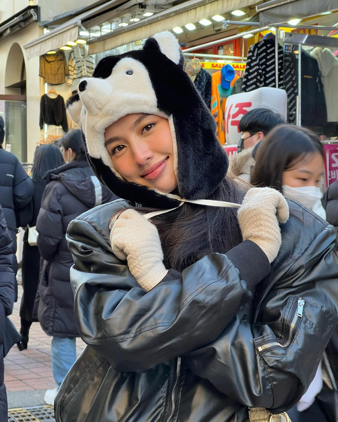 Trong khi nhiều mỹ nhân sẽ diện đồ sang chảnh khi đi du lịch thì Thùy Tiên lại chọn phong cách nhí nhảnh, đáng yêu. Như chiếc mũ hình chú cún này cùng với điệu bộ lí lắc giúp nàng hậu trông trẻ trung và gần gũi.