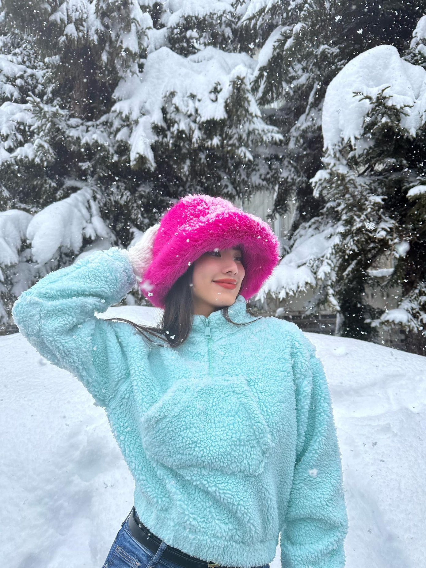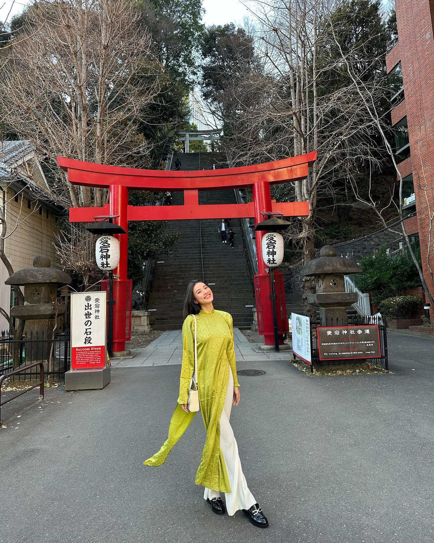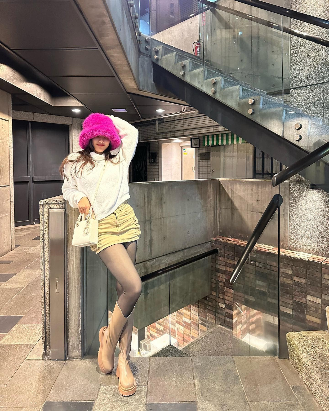 Á hậu Kim Duyên lại chọn Nhật Bản làm điểm đến đầu năm. Nàng hậu xem ra rất yêu thích chiếc mũ lông hồng rực này khi đội cùng nhiều set đồ khác nhau. Tuy nhiên, khán giả lại cho rằng Kim Duyên phối màu sắc chưa khéo nên trông hơi lạc quẻ.