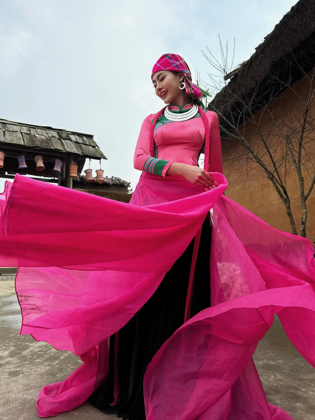 Hoa hậu Hoàn vũ Việt Nam 2024 Bùi Xuân Hạnh có một ảnh áo dài độc đáo, thiết kế được kết hợp giữa áo dài và trang phục dân tộc của người miền núi. Bộ ảnh được Hoa hậu Xuân Hạnh thực hiện tại Sapa.