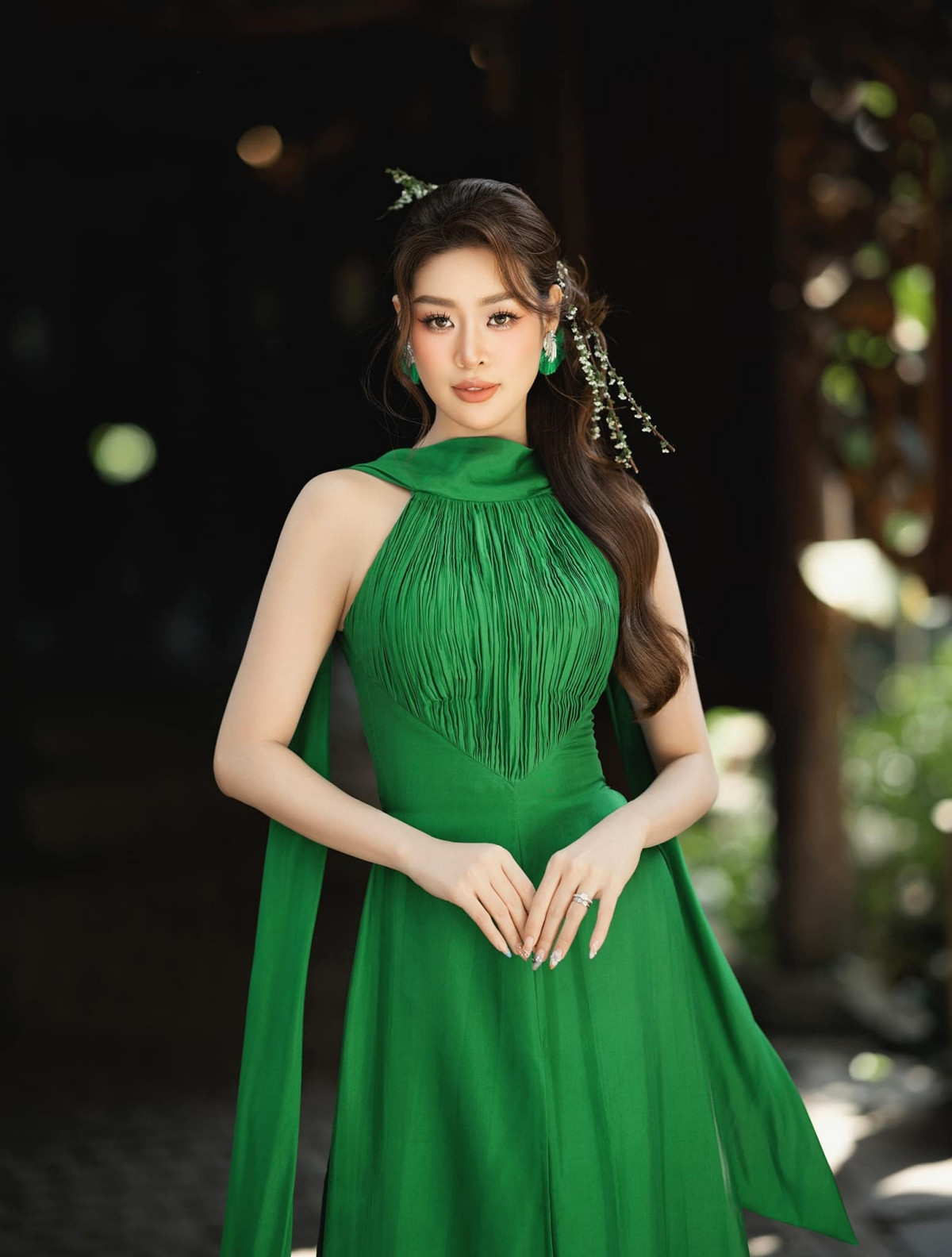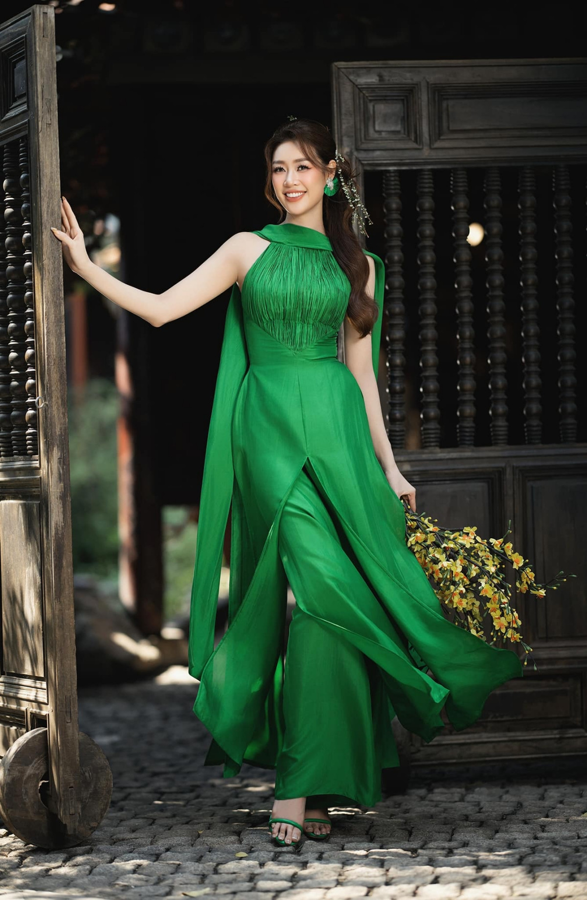Hoa hậu Khánh Vân chọn áo dài cách điệu màu xanh lá cây của NTK Lê Thanh Hoà cho bộ ảnh mới nhất, chào đón Tết Nguyên Đán.