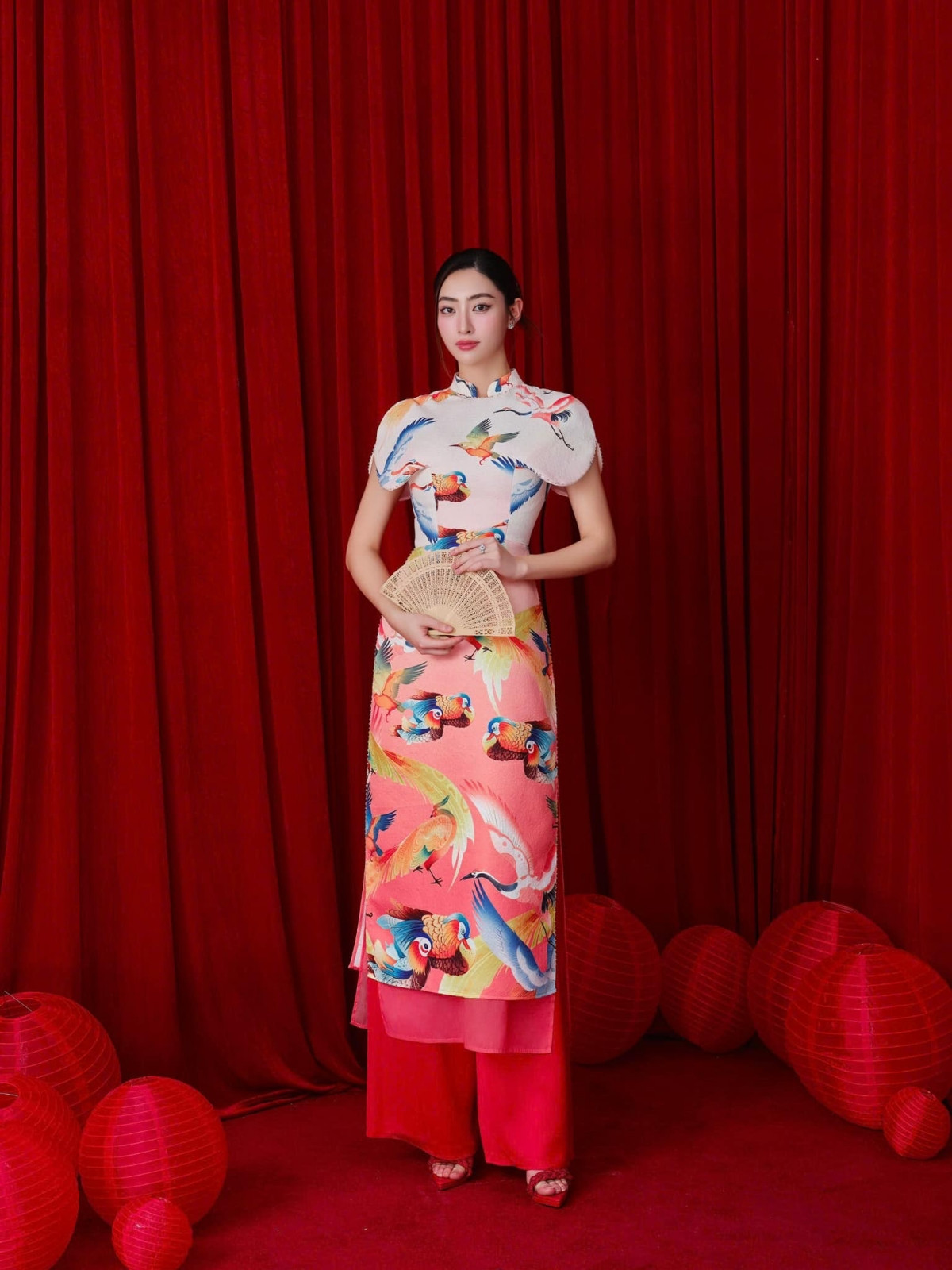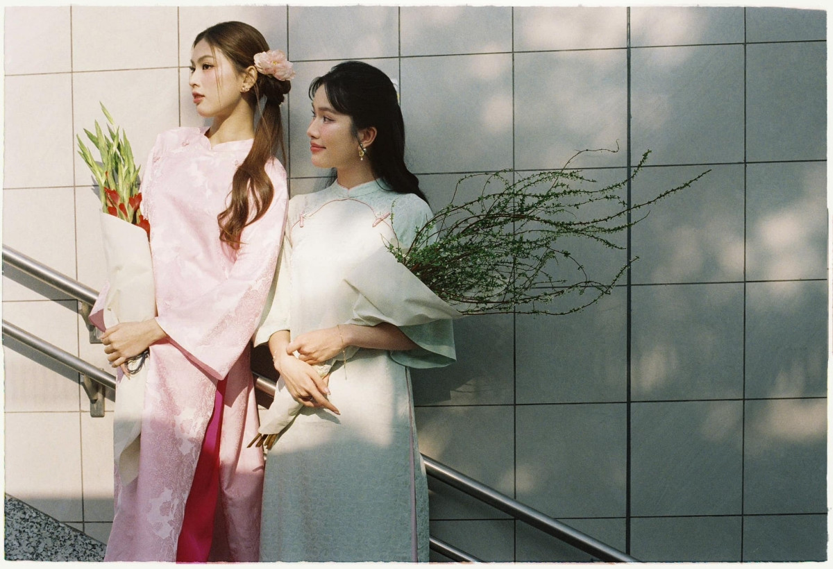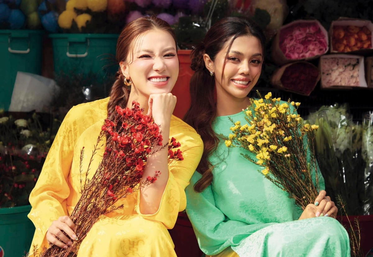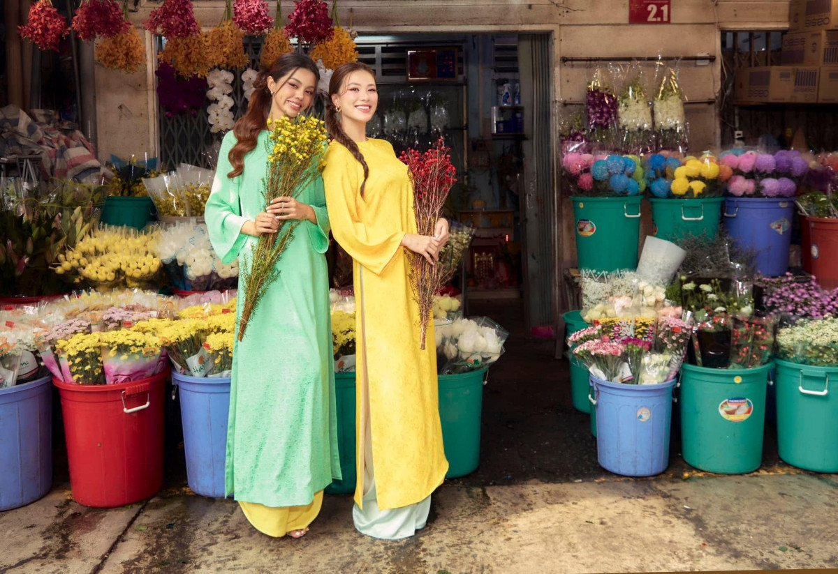 Á hậu 2 Miss Supranational 2022 Nguyễn Huỳnh Kim Duyên và Top 10 Miss Cosmo 2024 Leakena In người Campuchia trong bộ ảnh áo dài rực rỡ, đậm không khí Tết.