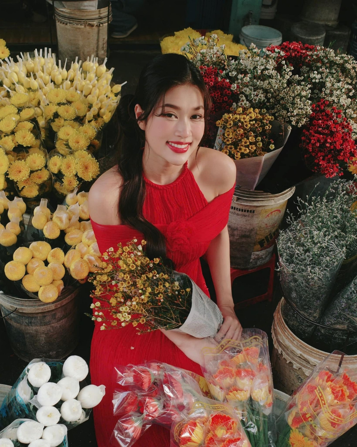 Hoa hậu Đoàn Thiên Ân cũng chọn mẫu áo dài từng được Á hậu Ngọc Thảo mặc trong bộ ảnh lookbook. Nàng hậu chọn địa điểm là một khu chợ bình dân.