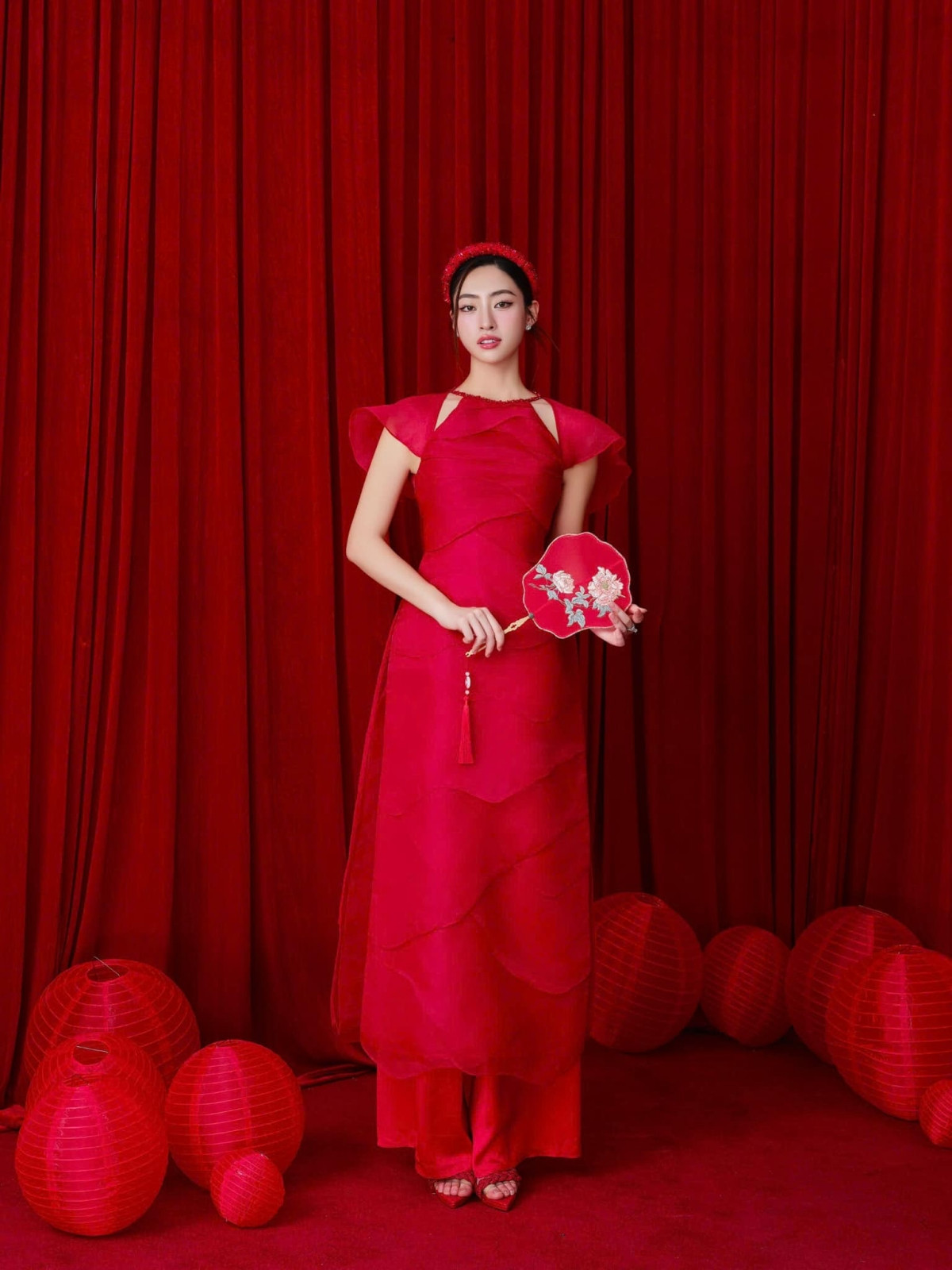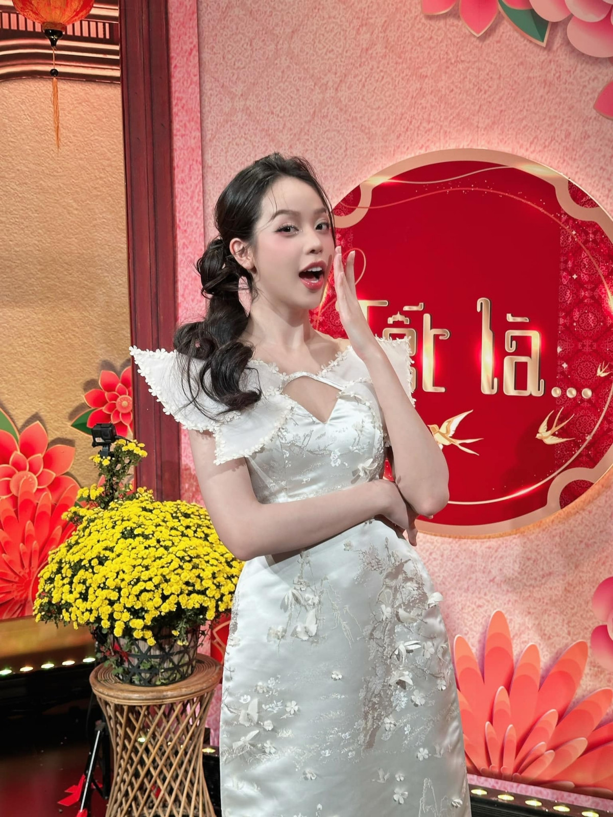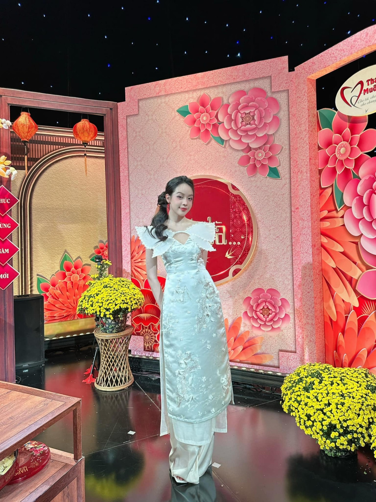 Miss International 2024 - Hoa hậu Việt Nam 2022 Huỳnh Thị Thanh Thủy cũng chọn áo dài trắng, với kiểu dáng cách điệu lạ mắt trong hoạt động ghi hình cho một chương trình Tết.