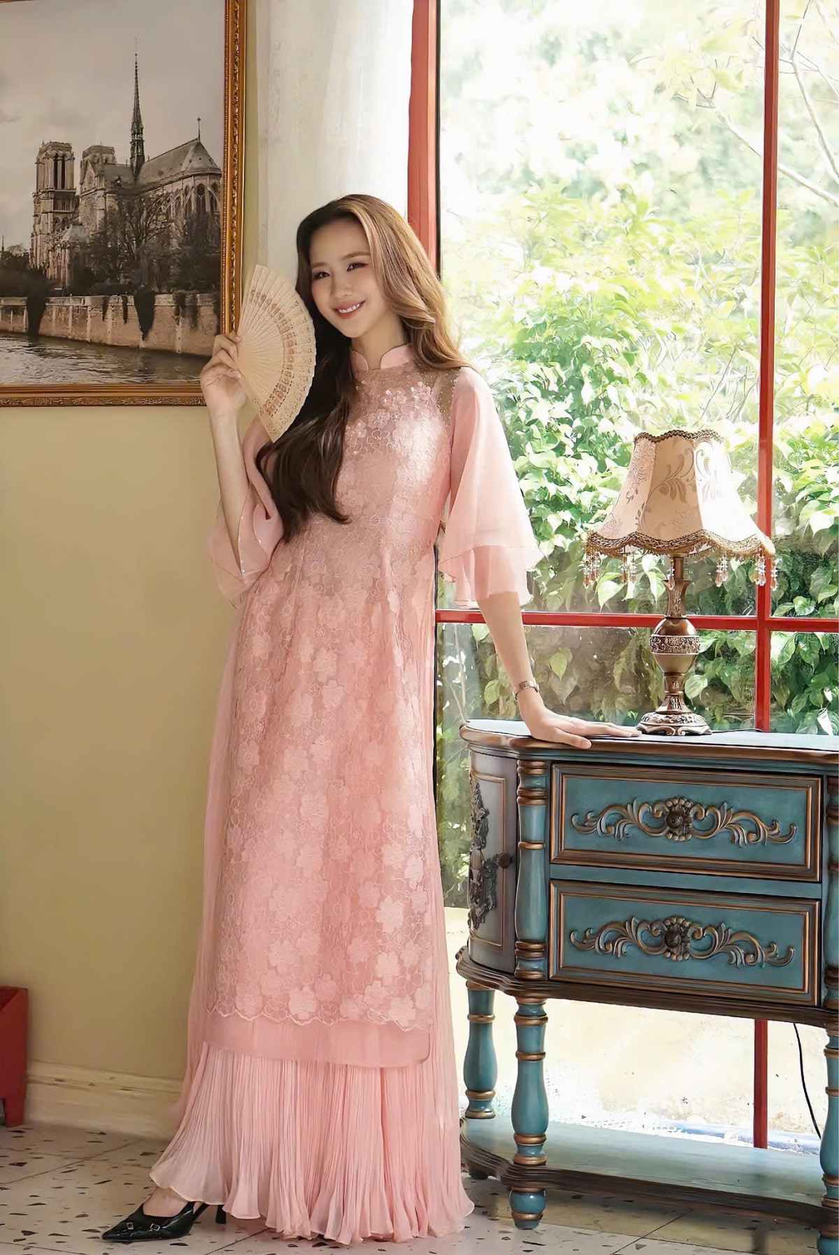 Hoa hậu Liên lục địa 2022 Lê Nguyễn Bảo Ngọc cũng chọn mẫu áo dài hồng mà Á hậu Ngọc Thảo từng mặc trong bộ ảnh lookbook. Đây là mẫu áo dài được khá nhiều người đẹp của showbiz Việt chọn mặc trong dịp này.