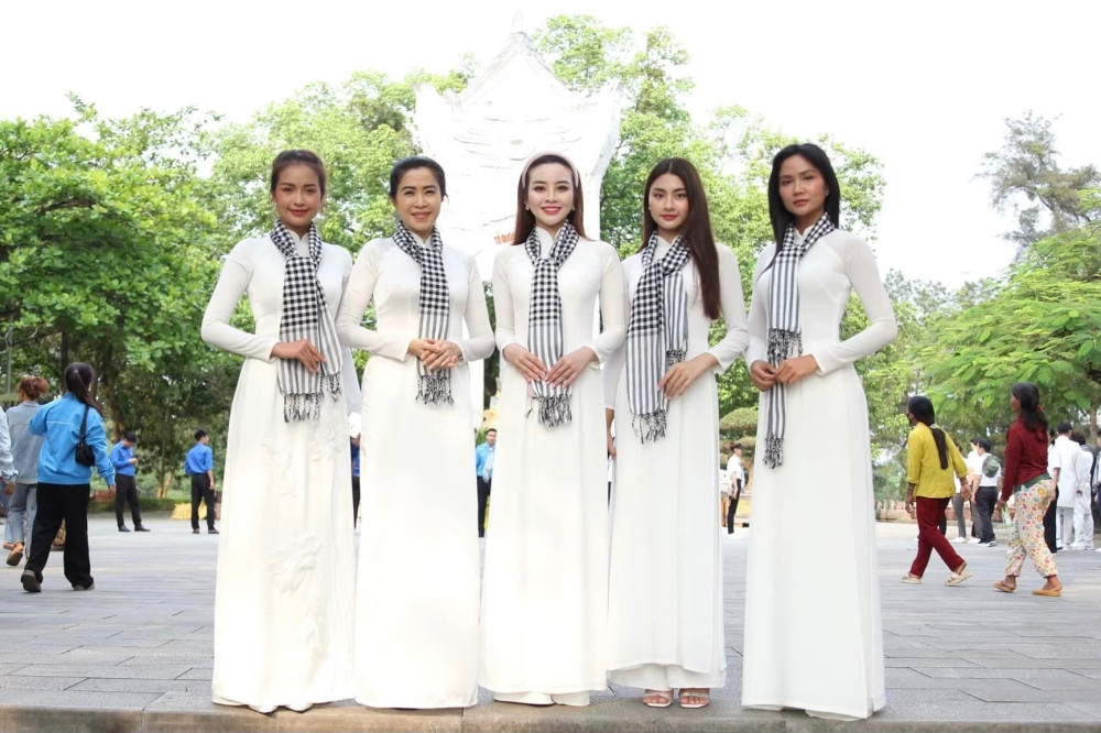 Các nàng hậu thuộc hệ thống Hoàn vũ cũng mặc áo dài trắng, đeo khăn rằn trong lễ dâng hương kỷ niệm ngày thống nhất đất nước.