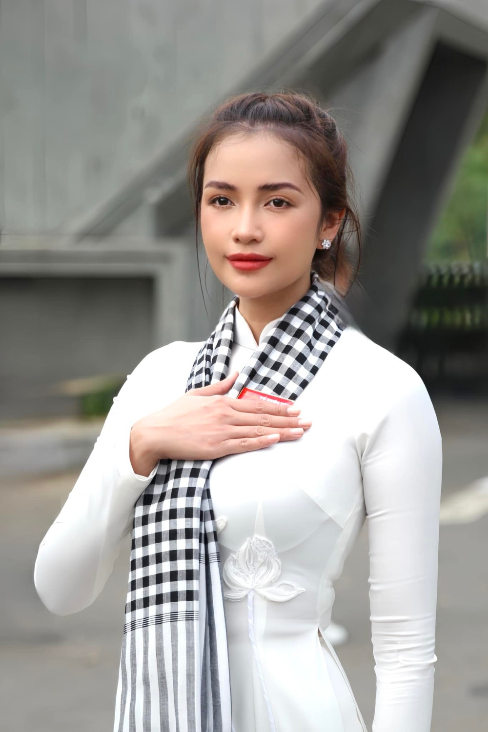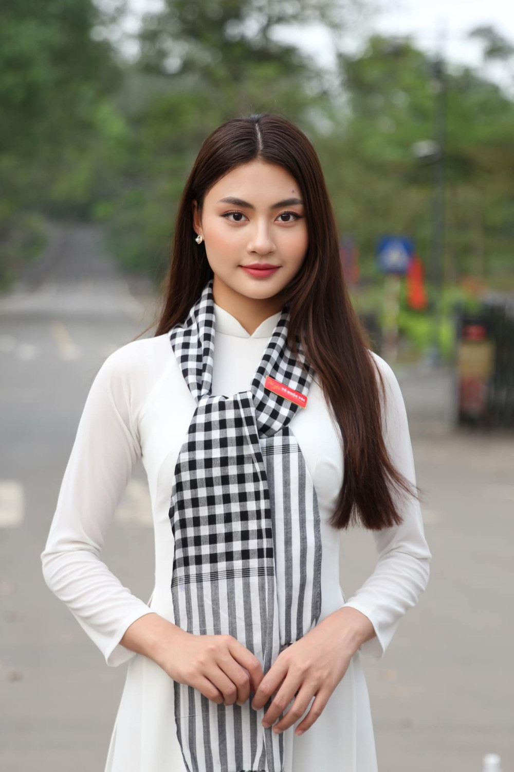 Hoa hậu Việt Nam 2022 Huỳnh Thị Thanh Thủy chọn quàng thêm chiếc khăn rằn.