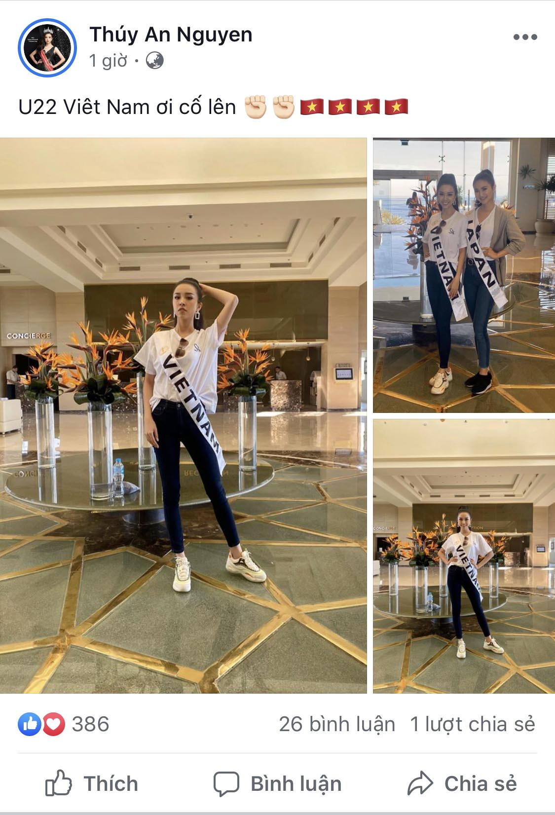 Á hậu Thuý An cổ vũ tuyển Việt Nam từ Ai Cập khi đang tham dự cuộc thi Hoa hậu Liên lục địa 2019.