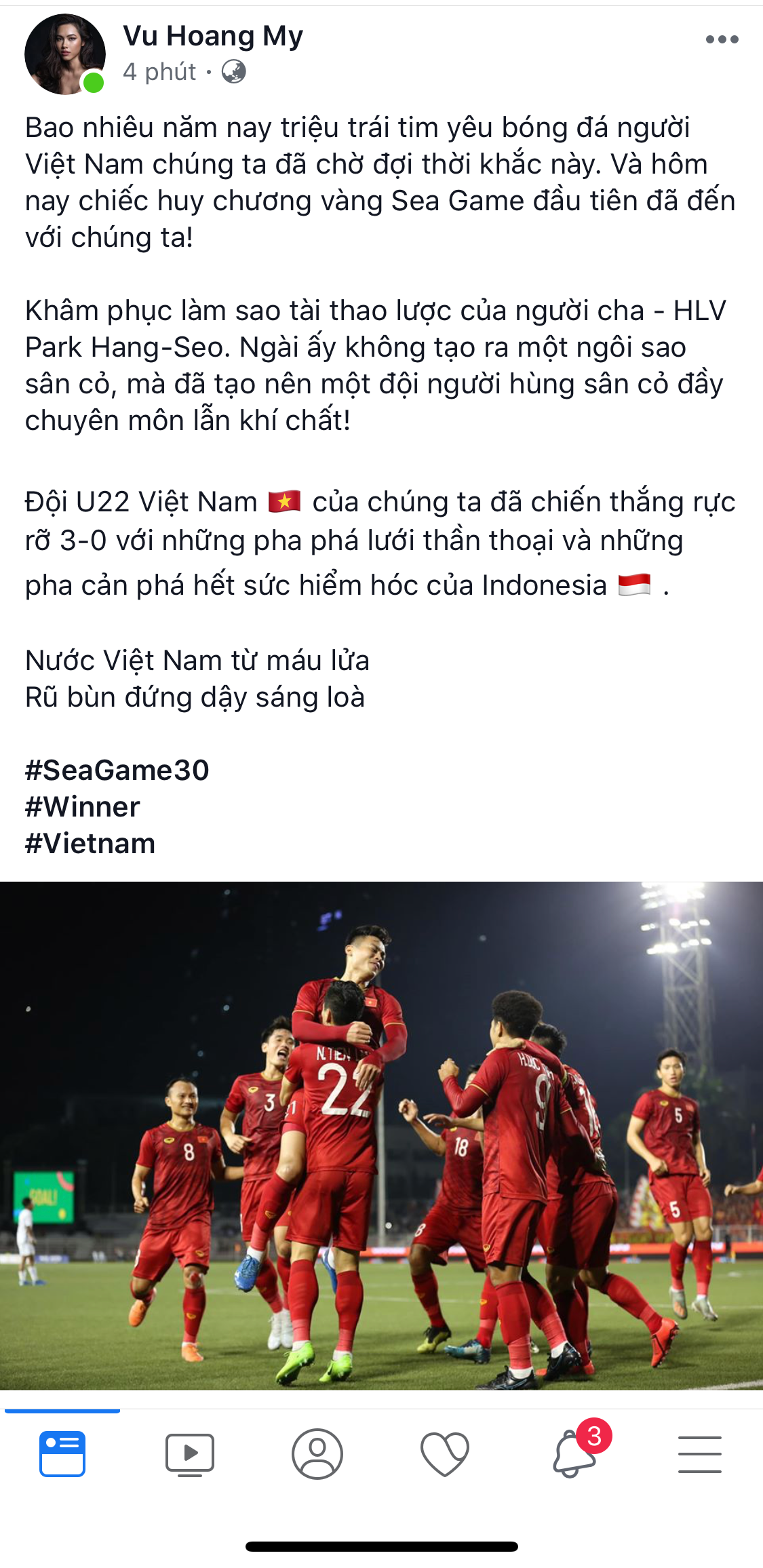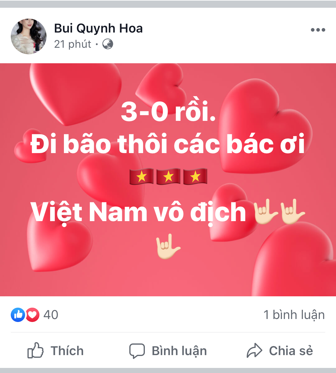Á hậu Hoàng My chia sẻ cảm xúc sau khi trận đấu kết thúc với chiến thắng lịch sử giành cho đội tuyển Việt Nam.