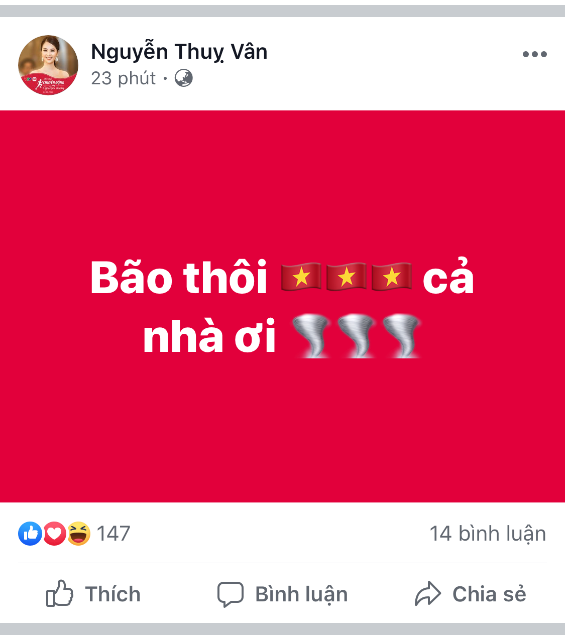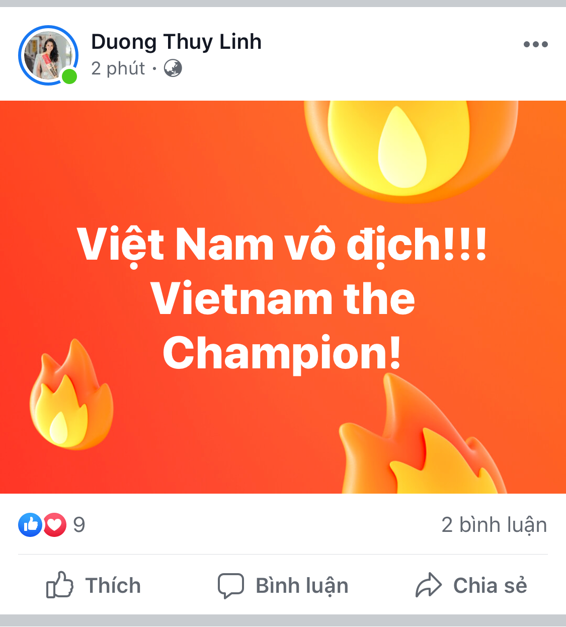 Á hậu Thuỵ Vân kêu gọi mọi người xuống đường 'đi bão' mừng Việt Nam vô địch SEA Games.