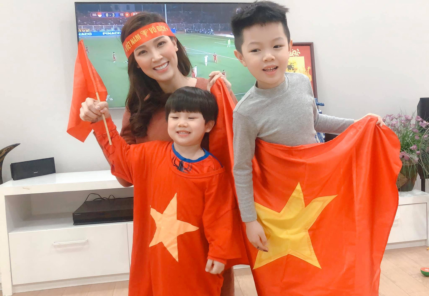 Hoa hậu Áo dài Phí Thuỳ Linh và hai con vỡ oà trong hạnh phúc khi Việt Nam chiến thắng.