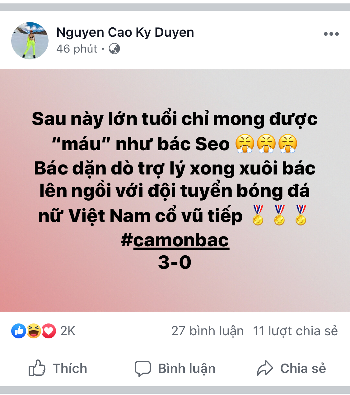 Hoa hậu Nguyễn Cao Kỳ Duyên tâm đắc với thái độ của HLV Park trong trận chung kết.