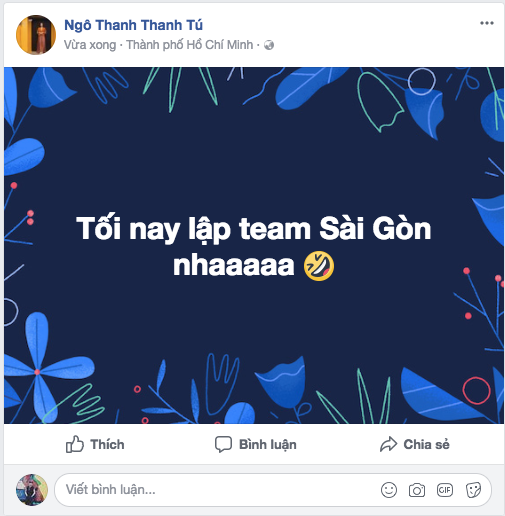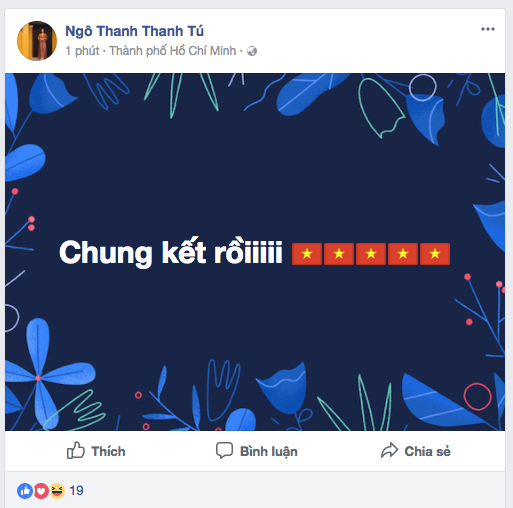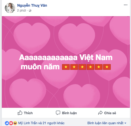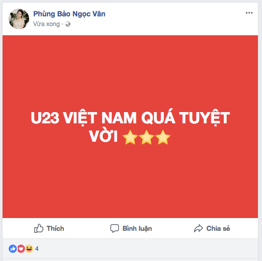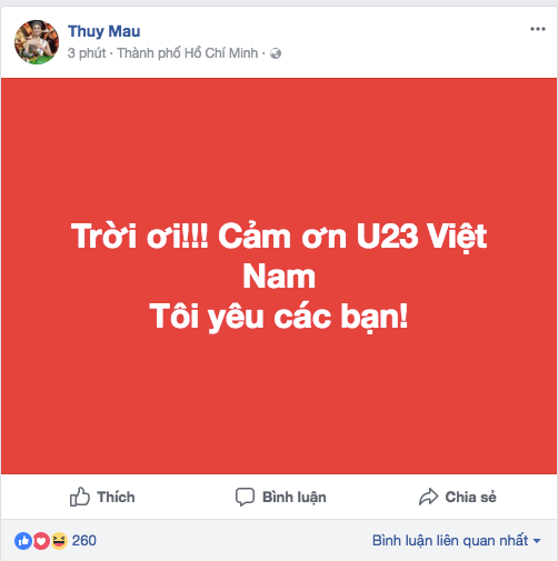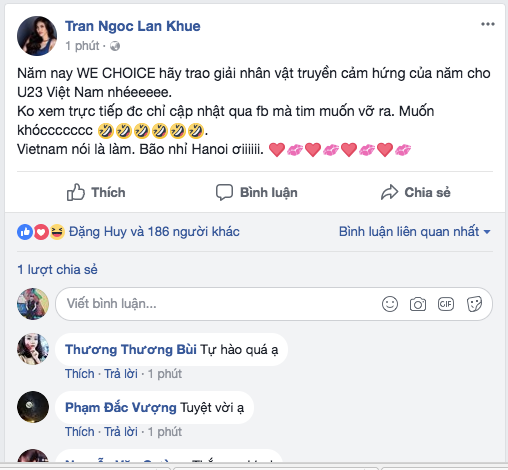 Cô còn hài hước kêu gọi bạn bè tối nay lập team để xuống đường cổ vũ U23 Việt Nam.
