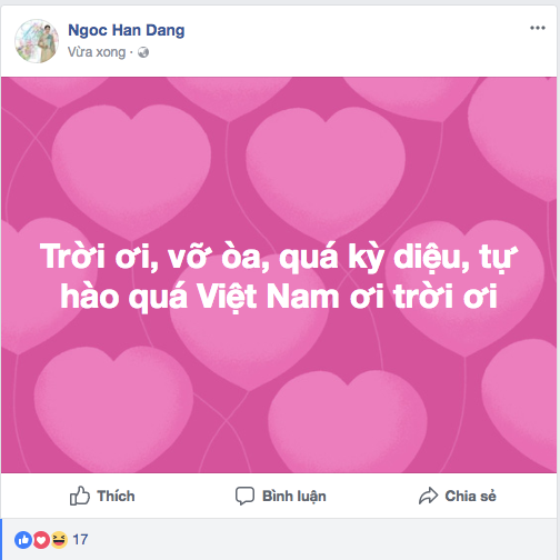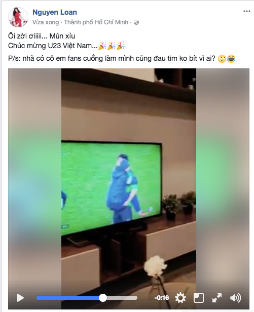 Ngay sau khi các cầu thủ U23 Việt Nam giành chiến thắng trước Quatar trong loạt đá luân lưu căng thẳng, hàng triệu fan hâm mộ đã vỡ oà trong cảm xúc và đăng đàn trên facebook để chúc mừng các cầu thủ. Hoa hậu Ngọc Hân cũng nói lời chúc mừng tới các anh chàng U23 Việt Nam.