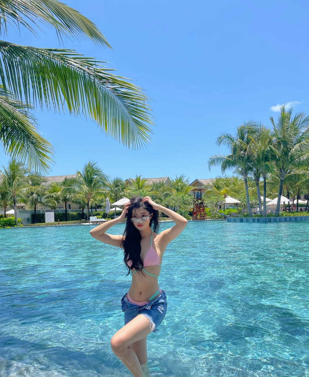 Á hậu Phương Nhi xinh đẹp đáng yêu trong set bikini màu hồng, khoe vòng eo nhỏ xíu.