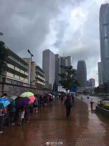 Hàng nghìn người dân mang theo ô, mũ, nón, thậm chí đầu trần đứng dưới cơn mưa như trút nước để có thể mua được một tấm vé lên thăm quan tàu sân bay Liêu Ninh khi chiếc tàu này cập cảng Hong Kong để kỷ niệm 20 năm ngày Khu Hành chính Đặc biệt Hong Kong được Anh trao trả lại cho Trung Quốc Đại lục. Nguồn ảnh: Sina.