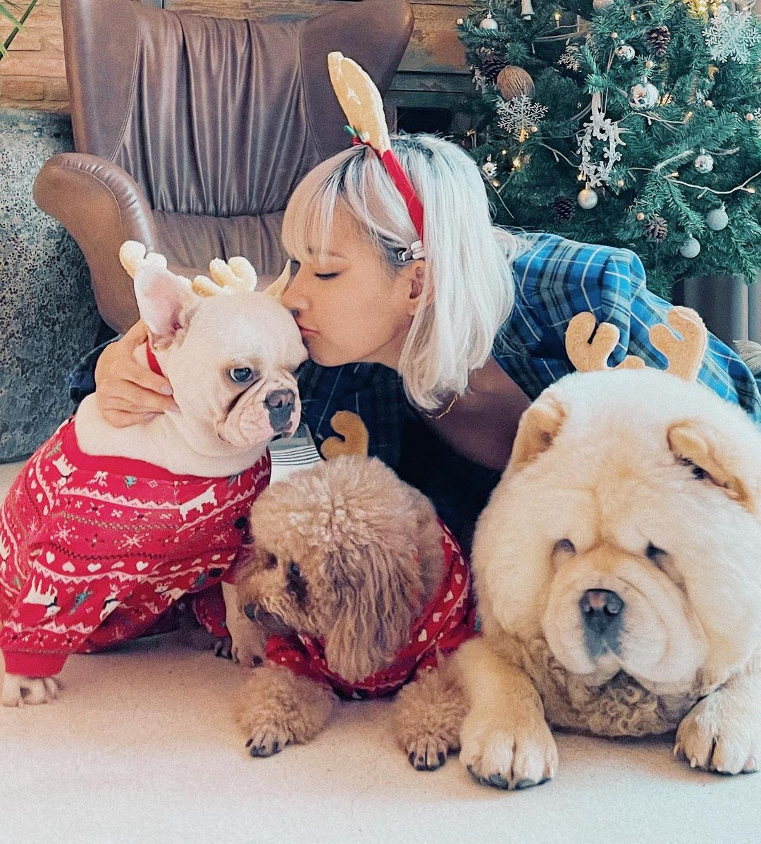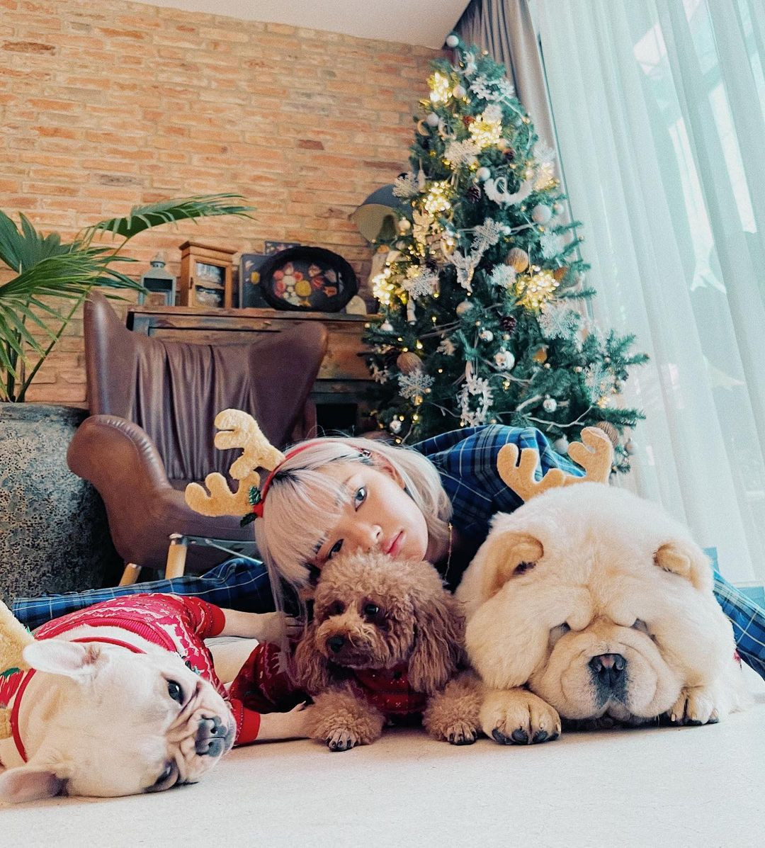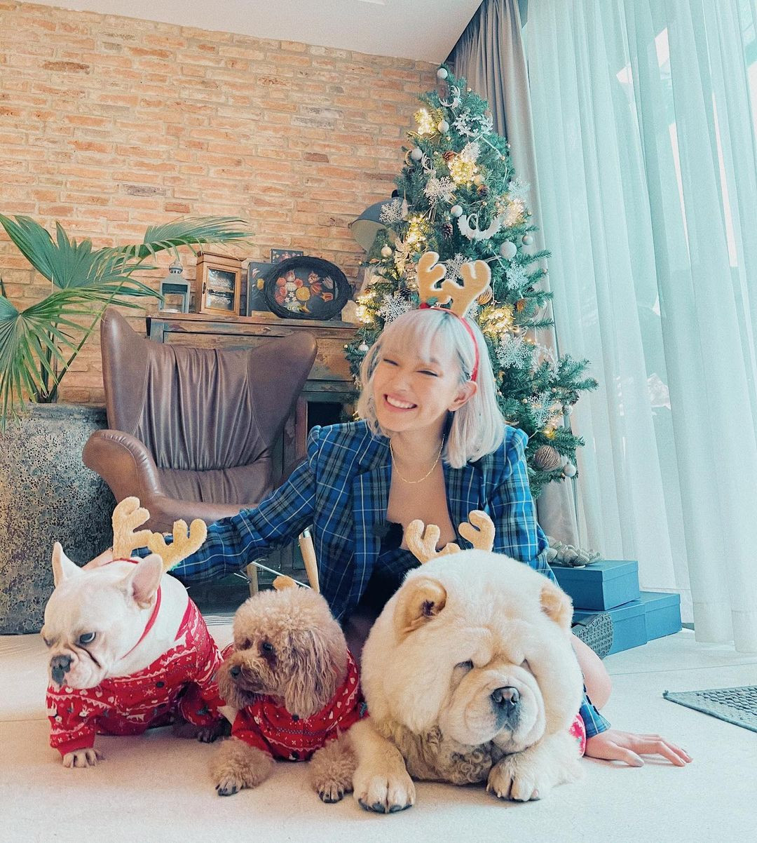 Đeo bờm tuần lộc, Châu Bùi tươi tắn rạng ngời bên dàn cún cưng.