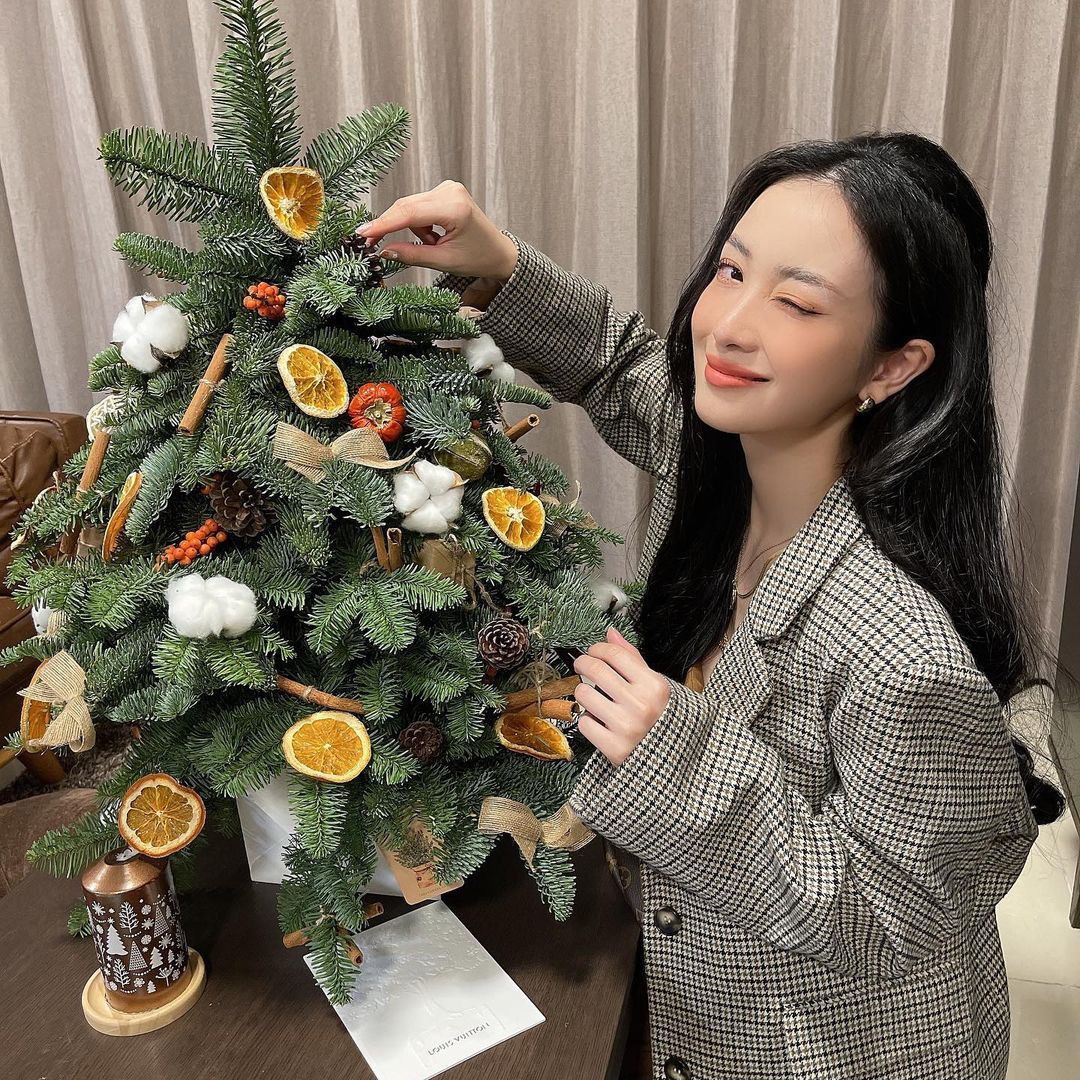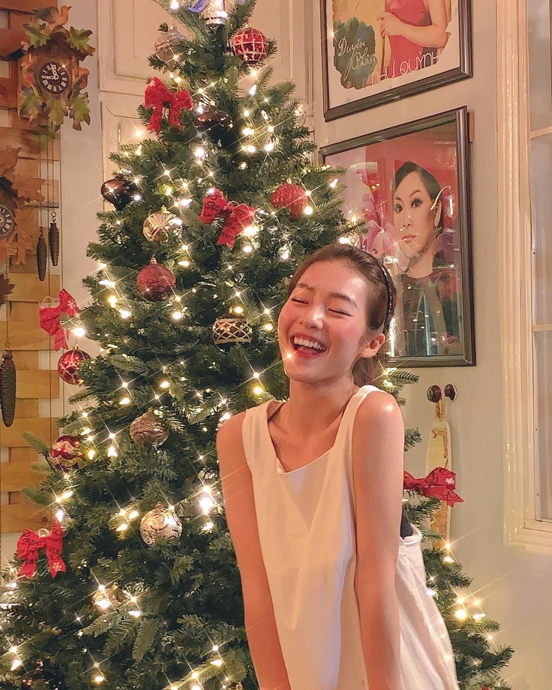 Nữ ca sĩ khoe cây thông lớn được trang trí lung linh đẹp mắt.