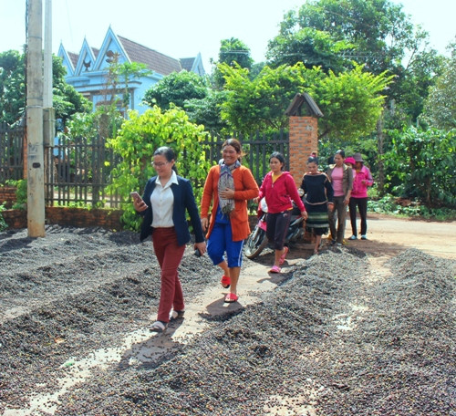 Bà con bước qua sân phơi cà phê vào nhà H' Hen để cùng xem ti vi về cuộc thi Hoa hậu Hoàn vũ.