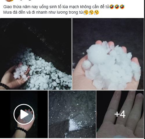 Bên cạnh đó, tại một số tỉnh phía Bắc, xuất hiện mưa đã khiến nhiều người dùng mạng ngán ngẩm chia sẻ: "Giao thừa năm nay uống sinh tố lúa mạch không cần để tủ. Mưa đá đến và đi nhanh như lương túi".