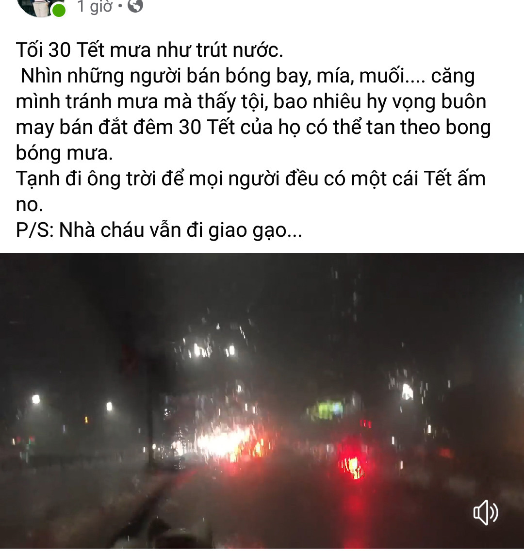 Trong khi một người dùng mạng tỏ ra thương cảm với những người bán rong trong ngày 30 Tết khi viết "Tối 30 Tết, trời mưa như trút. Nhìn những người bán bóng bay, mía, muối,...căng mình tránh mưa mà thấy tội, bao nhiêu hy vọng buôn may bán đắt đêm 30 Tết của họ có thể tan theo bong bóng mưa. Tạnh đi ông trời để mọi người cùng có một cái Tết ấm".