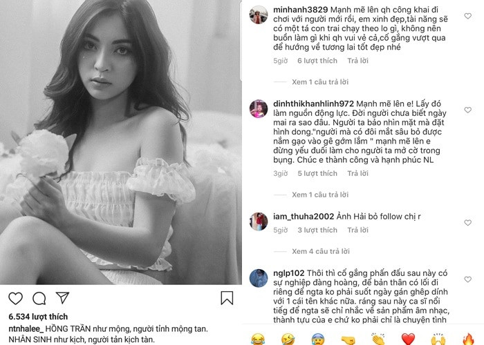 Nhiều fan hâm mộ lập tức động viên Nhật Lê cần vượt qua nỗi buồn. Một fan bình luận: “Mạnh mẽ lên, Quang Hải công khai đi chơi với người mới rồi. Em xinh đẹp và tài năng sẽ có một tá con trai chạy theo, lo gì. Không nên buồn làm gì khi Quang Hải vui vẻ cả, cố hắng vượt qua để hướng về tương lai tốt đẹp nhé”.