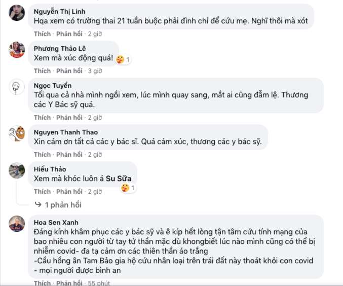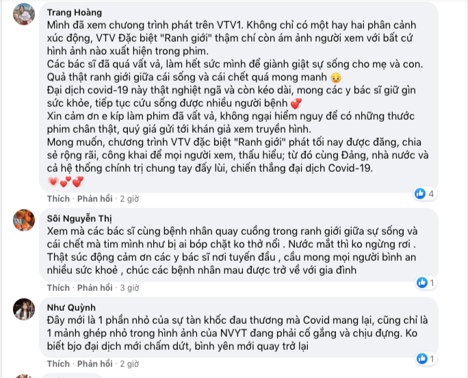 Tài khoản có tên T.K viết: “Những thước phim rất đáng để xem. Xem để thấy ranh giới của sự sống và cái chết mong manh thế nào? Để mọi người sống tử tế và trân quý hơi thở, mạng sống và tất cả những gì mình đang có. Xem để trân trọng và cảm ơn đội ngũ tuyến đầu đã dốc sức đấu tranh với thần chết giành giật sự sống cho từng ca bệnh vất vả, gian nan như thế nào? Cảm ơn VTV đã làm 1 bộ phim rất chân thực, cảm ơn ekip đã dũng cảm lao vào tâm dịch quay được những thước phim để đời như này”.
