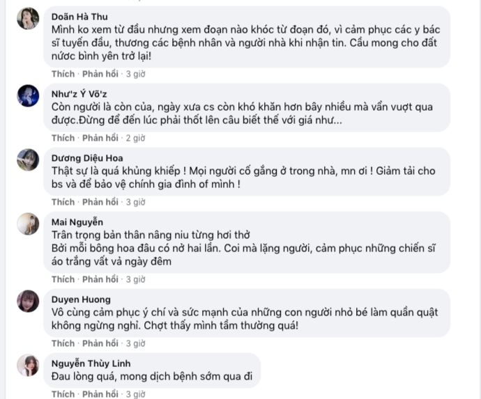 Tài khoản N.H.K.L chia sẻ: “Không bom đạn, không khói lửa. Không máu me, không gào thét. Âm thanh chủ yếu là tiếng máy móc, tiếng gọi đến hỗ trợ bệnh nhân. Thước film ghi lại những điều đang xảy ra. Tôi và chúng ta. Những đánh đổi, không điều gì sánh nổi. Cảm ơn các thiên thần áo trắng đã ngày đêm chắp cho bệnh nhân thêm 1 niềm hy vọng. Việt Nam sẽ vượt qua”.