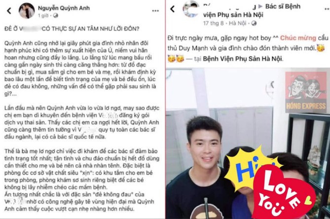 Ngay sau đó, dân mạng khui ra bức hình do một bác sĩ đăng tải ngày 17/8, cho thấy Duy Mạnh đang chuẩn bị chào đón con đầu lòng ở Bệnh viện Phụ sản Hà Nội chứ không phải như lời kể của Quỳnh Anh. Dưới phần bình luận, khi có người hỏi “Vợ cầu thủ nằm khoa nào đấy để mai em đến chơi”, bác sĩ cũng trả lời rõ ràng “D3 em nhé!”.
