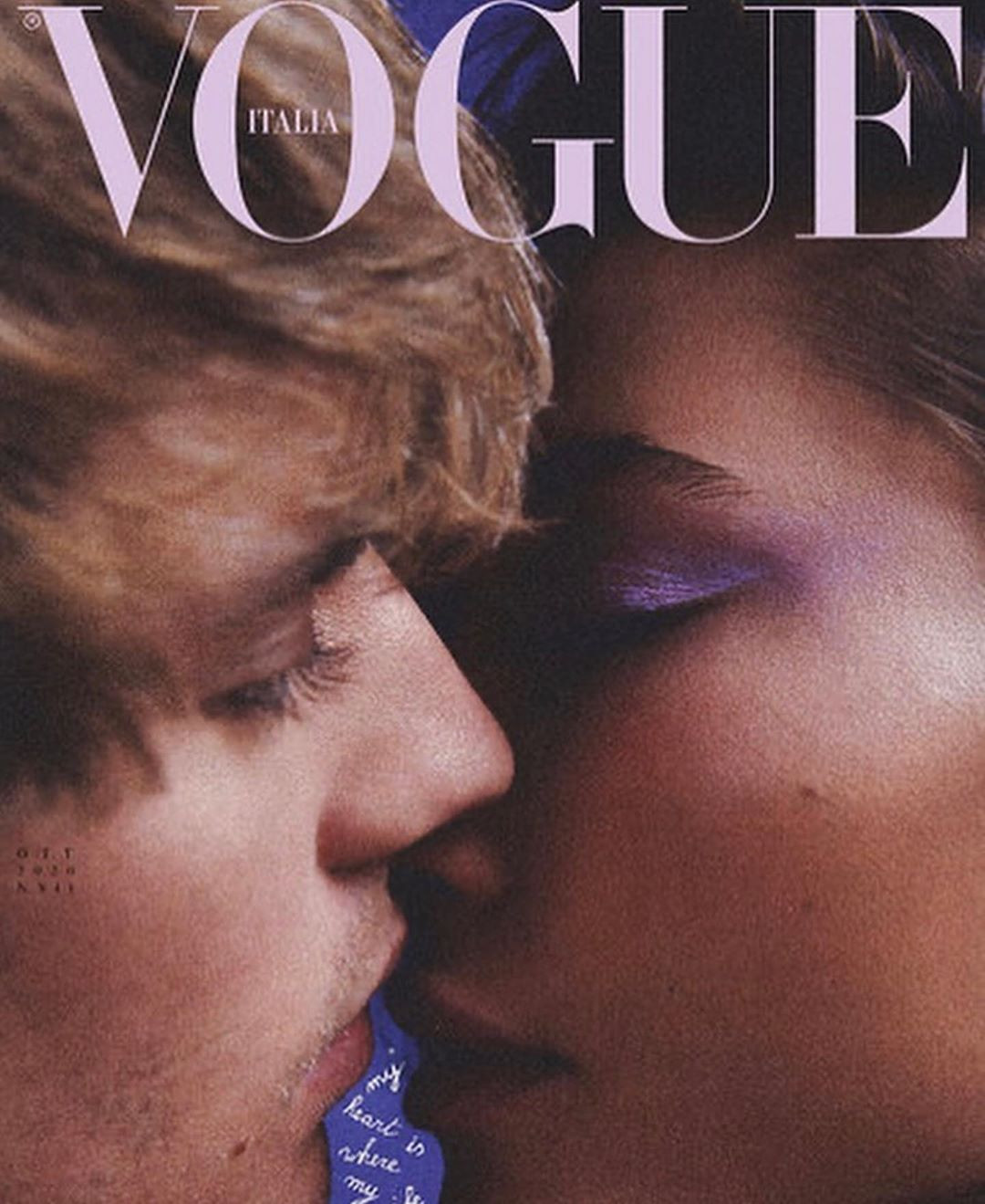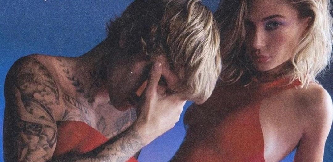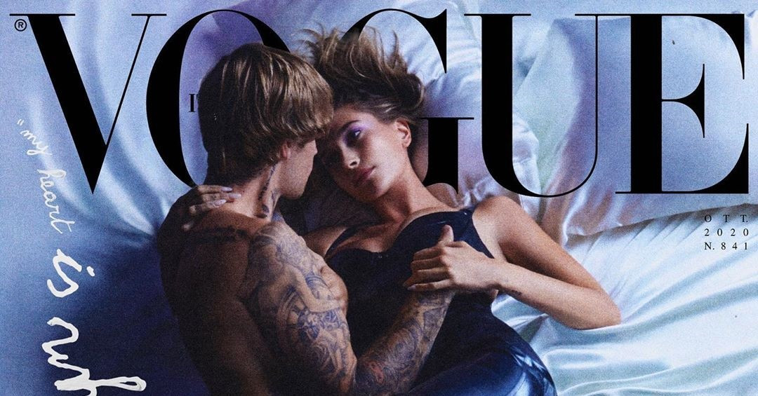 Ảnh bìa tạp chí Vogue Italia số tháng 10 là khoảnh khắc môi kề môi ngọt ngào lãng mạn của Justin và Hailey Bieber.