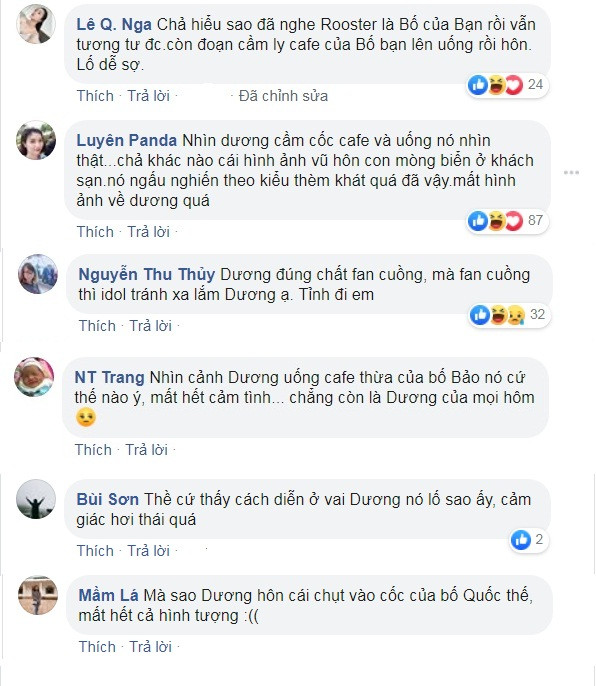 Tuy nhiên, luồng ý kiến chỉ chiếm thiểu số, đa phần đều bày tỏ ý kiến không ủng hộ. Theo tài khoản Mai Lê, Dương thích ông Quốc kiểu nam-nữ “không ổn chút nào”. Trong khi đó, người dùng Nhung Hoàng tuyên bố sẽ không xem phim nữa nếu phim phát triển theo hướng đó. Không chỉ vậy, dân mạng cảm thấy hành vi uống thừa tách cà phê của Dương có phần "bệnh hoạn", mất hình tượng.