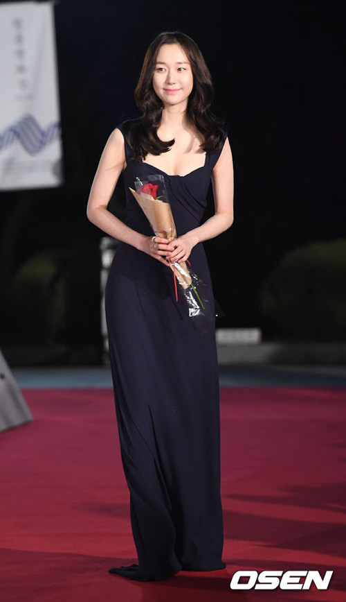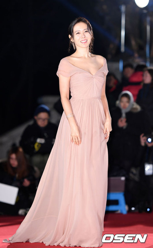Lễ trao giải điện ảnh Rồng Xanh 2016 diễn ra tối 25/11. Son Ye Jin diện đầm pastel khoét ngực rộng lên thảm đỏ.