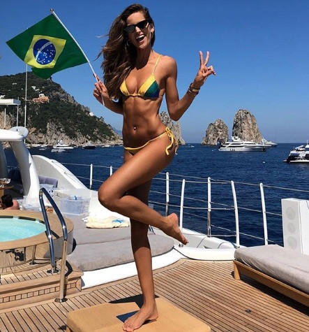 Cựu thiên thần nội y Alessandra Ambrosio đang có công việc ở nước ngoài nhưng cũng gửi lời chúc chiến thắng tới các chàng trai đội nhà.