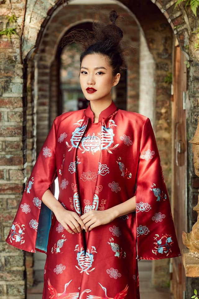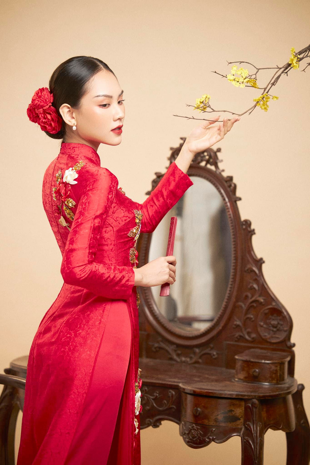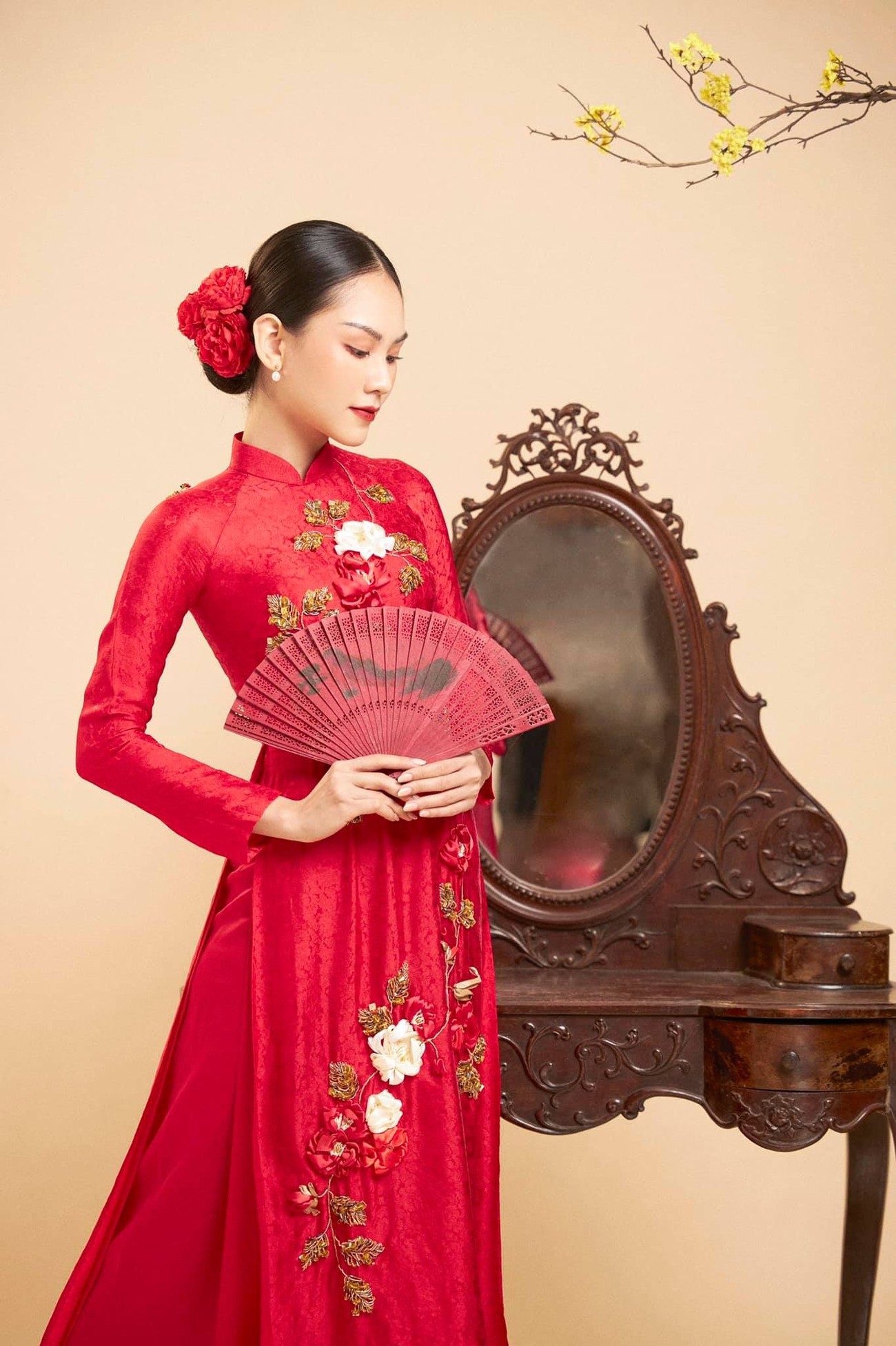Áo dài Tết với gam màu đỏ đặc trưng cùng những họa tiết thêu cầu kỳ mang lại vẻ đẹp liêu trai, hoài cổ.
