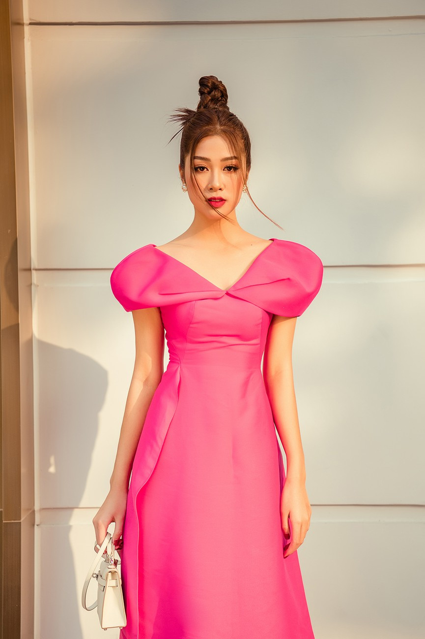 Áo dài cách tân kiểu trễ vai gợi cảm cùng tông màu hồng trẻ trung cũng là một gợi ý thú vị cho ngày Xuân.