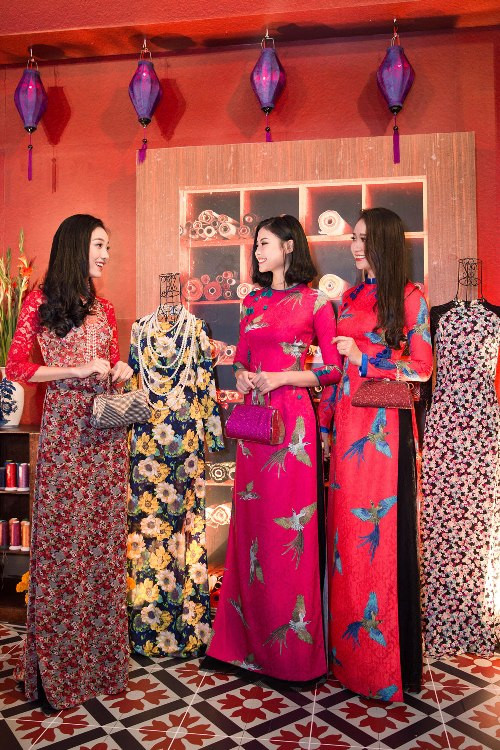 Hoa khôi Huỳnh Thúy Vi chia sẻ: “Chiếc áo dài mang nét hoài cổ, thể hiện đầy đủ nét đẹp của người phụ nữ vừa cổ điển, vừa hiện đại. Bản thân cảm thấy rất tự hào khi khoác lên mình chiếc áo dài này, đặc biệt là vào ngày Tết”. Hoa khôi Huỳnh Thúy Vi (người ngồi may) cùng dàn người đẹp