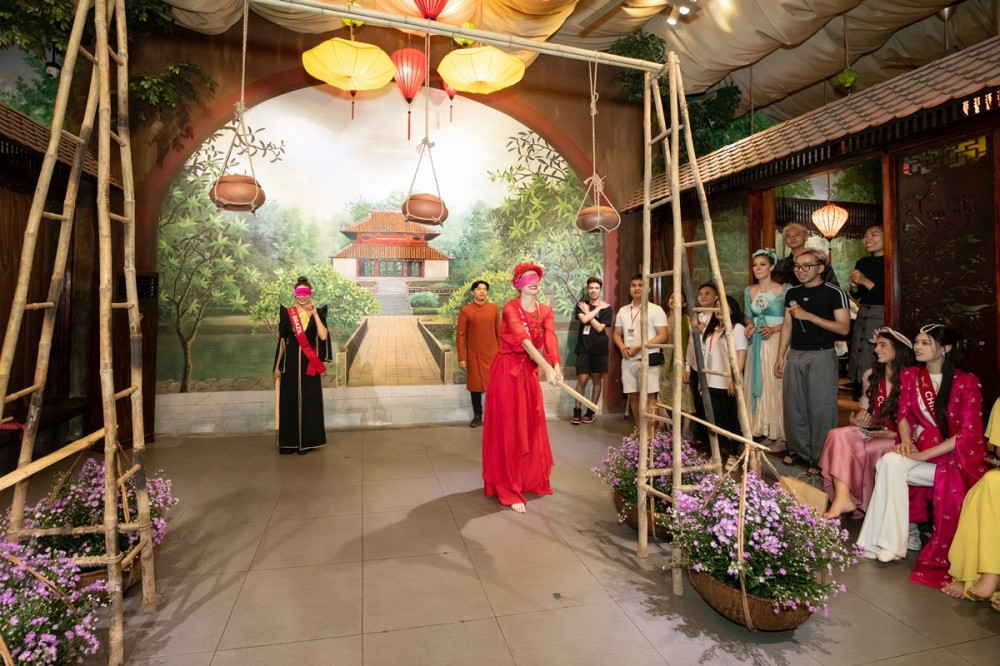 Trong không gian mang đậm nét văn hóa Bắc, các thí sinh nhảy múa theo điệu nhạc truyền thống, chơi trò bịt mắt đập niêu và không ngừng tấm tắc khi thưởng thức những món ăn quen thuộc trong mâm cơm của gia đình Việt.
