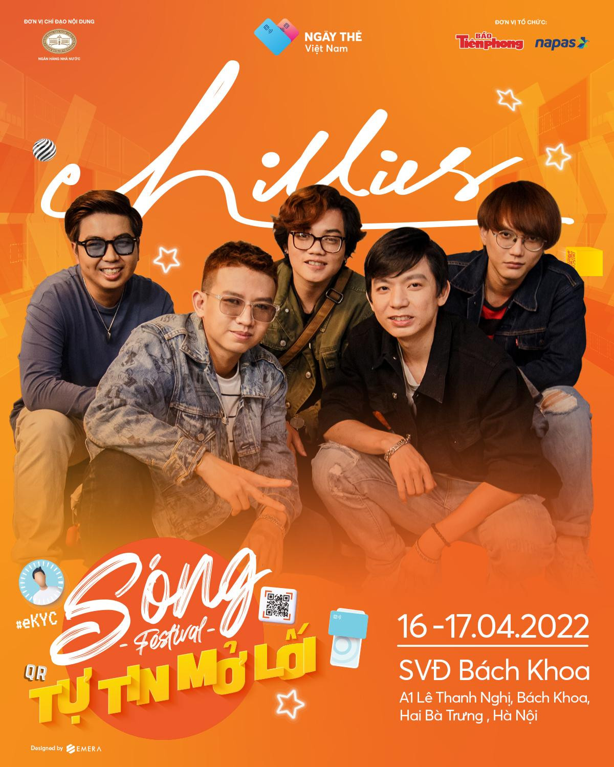 Năm chàng trai Chillies cũng xuất hiện ngay trong ngày khai mạc 16/4. Chillies được biết đến là nhóm nhạc táo bạo, dám thử thách bản thân ở nhiều thể loại âm nhạc khác lạ để thành công. Âm nhạc của nhóm mộc mạc nhưng sâu lắng và gây thương nhớ. Đến với 'Sóng Festival', Chillies chiêu đãi người nghe chùm ca khúc được yêu thích nhất của nhóm.